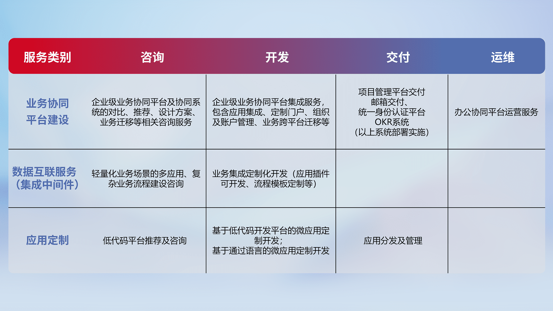 针对钉钉、、、、企微、、IDaas等平台级产品提供产品的规划、、方案、、交付、、、定制化开发等服务,,,实现如统一协同办公、、、智能客户服务、、、混合会议管理、、、、智能数据查询、、、、等业务场景,,实现数字化转型。。